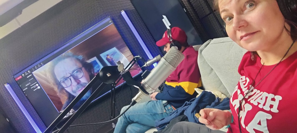 Kuvassa käynnissä etäyhteydellä keskustelut standup-koomikko Ilari Johanssonin kanssa. Hän oli parhaillaan kiertueella pohjoisessa, joten studiovierailu ei onnistunut. Eikä meinannut etäilykään ensin onnistua, koska tekniikka heitti hieman kapuloita rattaisiin… Mutta selvittiin tästäkin lopulta!