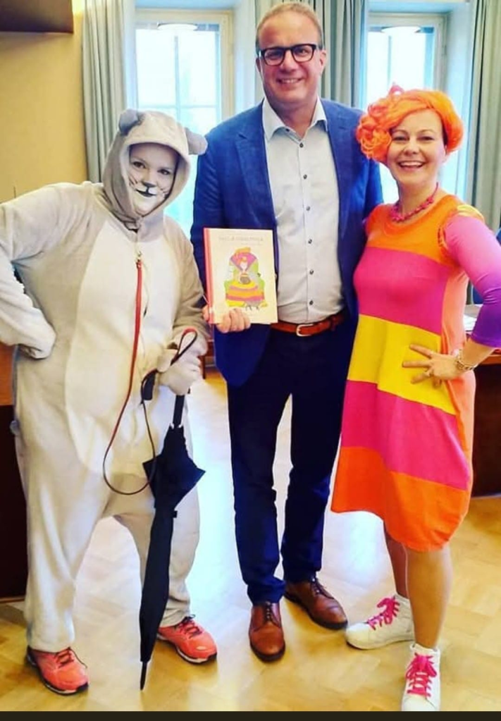 Lahden uuden kaupunginjohtajan (vuonna 2018 aloittanut Pekka Timonen) kävimme Annan kanssa toivottamassa tervetulleeksi viemällä hänelle lämpimäisiksi esikoislastenkirjamme työpöydälle. Mitään vahinkoa emme kuitenkaan tuolla käynnillä saaneet aikaiseksi, vaan ainoastaan hyvää mieltä. Kaupunginjohtaja oli oitis juonessa mukana Hugo-kissan tiedustellessa, että tietääkö herra pääherra missä mahtaa olla vieraiden hiekkalaatikko kaupungintalolla. Tiesi ja antoi ohjeet naistenhuoneeseen.